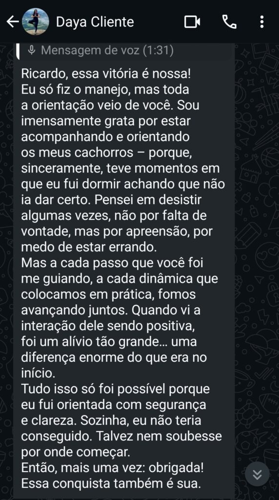 sempre de forma justa e transparente. O objetivo é que o cão aprenda com clareza, respeite limites e viva em harmonia com a família. Como parte do processo, o treinamento também envolve as pessoas da casa, garantindo que a obediência se mantenha no convívio diário.